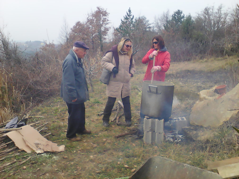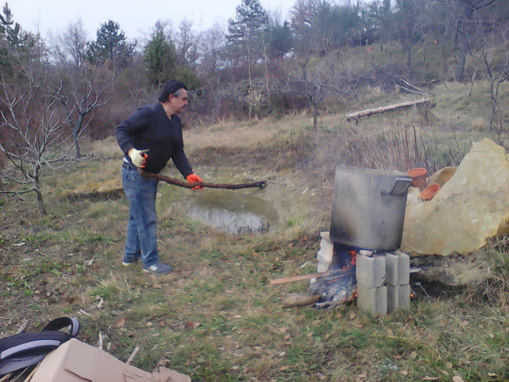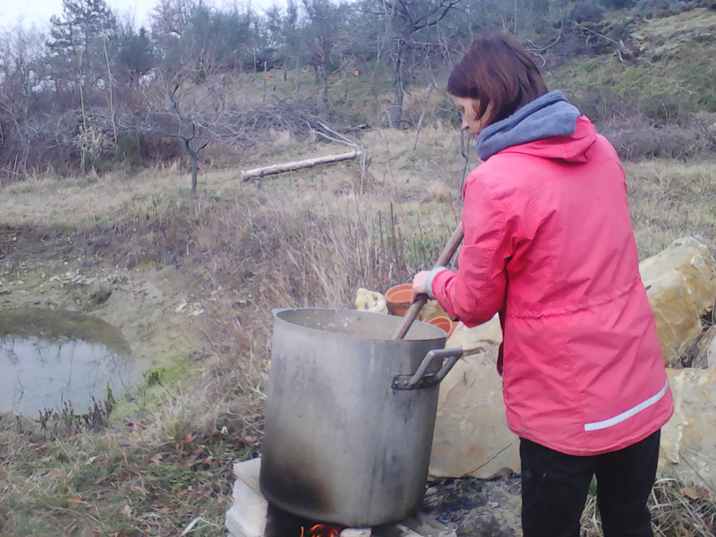 V januarju je še pravi čas, da se opravi zimska zaščita rastlin. Z našim krožkom smo rekli, da bi se naučili pripraviti apneno-žvepleno žavbo za zimsko špricanje, pa tudi maso iz kravjeka za premaz debel. Ines, ki malo bolj sledi tem biodinamičnim zadevam, nam je preskrbela zapise o pripravi in uporabi preparatov. Potem smo pripravili sestavine in začeli kuhati. Alberto je pazil na ogenj, Ines je ob mešanju pazila na temperaturo in barvo, Leda je skrbela, da je vse pri roki, nekateri pa so se sprehajali in kdaj pa kdaj pokukali, kaj se dogaja. Premaz iz kravjeka je bil dokončan šele čez nekaj dni. Drevesa so bila po premazu debel zelo srečna.