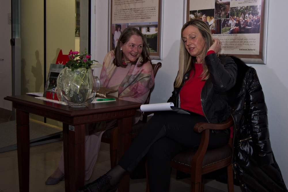 Na prvi sliki Andreja Blažič Klemenc bere odlomek iz knjige. Na desni voditeljica pogovora, Tanja Jakomin Kocjančič in avtorica knjige.